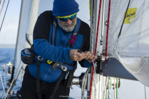 Enfant, Andrea réalise très vite que partir seul à bord d’un petit dériveur sur le lac de Côme répond à ses désirs encore mal formulés de solitude. Mais ce n’est qu’en 2022 qu’il décide de pousser à fond l’expérience maritime en solitude et au très grand large. « J’ai acheté Bibi, un Rustler 36, voilier robuste adapté aux exigences extrêmes de la course avec sa quille longue, ses grandes capacités de charge, et sa stabilité pour les mers du Sud. Je me suis lancé d’emblée et pendant 6 mois dans des navigations en solitaire, vers les Açores, les Canaries et la Mer d’Irlande. J’ai découvert que j’étais un marin d’eau douce. Alors je me suis installé en Bretagne (Port La Forêt) où j’ai été merveilleusement accueilli. J’y apprends toutes les ficelles du métier de marin, voilerie, matelotage… J’apprends à devenir marin d’eaux salées. »